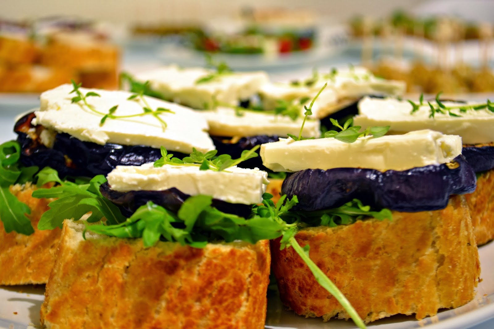 - Bagietkę skrapiamy oliwą, kładziemy na niej rukolę, plastry bakłażana, ser i po gałązce tyminaku, skrapiamy oliwą i posypujemy świeżo zmielonym pieprzem